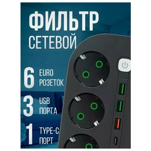 Сетевой фильтр, удлинитель бытовой 6 розеток, 3 USB,1 Type-C, разветвитель, 3 метра, черный