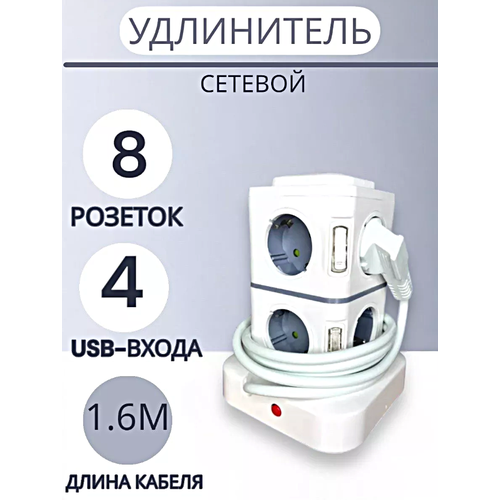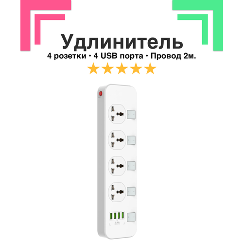 Сетевой фильтр удлинитель розетка для дома и дачи LD4408, 4 входа для розетки и 4 USB, кабель 2 метра