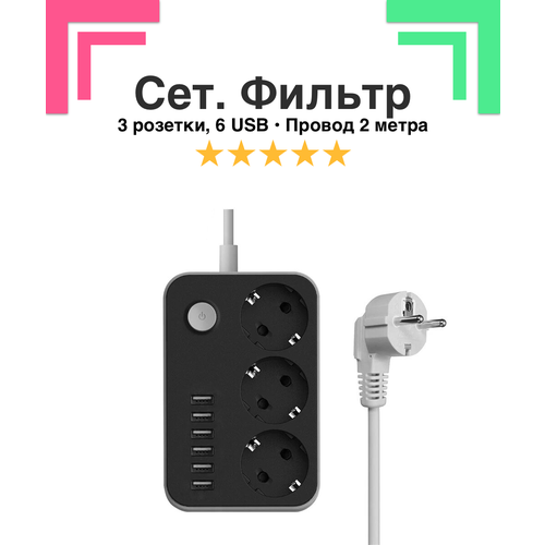 Сетевой фильтр тройник розетка для дома и дачи POWER SOCKET, 3 входа для розетки и 6 USB, кабель 2 метра