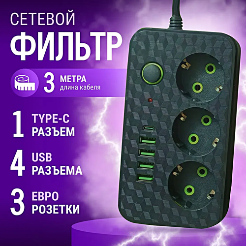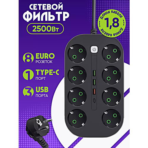 Cетевой фильтр, Удлинитель бытовой, Пилот, Разветвитель, 3 USB, 1 Type-C, 8 розеток, Макс. нагрузка 2500 Вт, Черный