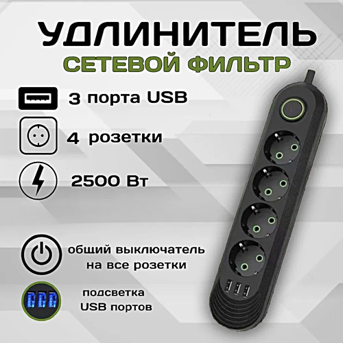 Cетевой фильтр MNS-2503, Удлинитель бытовой, Пилот, Разветвитель, 4 USB, 1 Type-C, 3 розетки, Макс. нагрузка 2500 Вт, Черный
