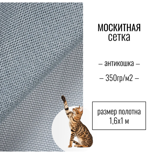 Сетка оконная ПВХ прочная, антикошка, москитная сетка, сетка на окно, ширина 1,6м, длина 1 метр, наотрез, серая, 350гр/м2