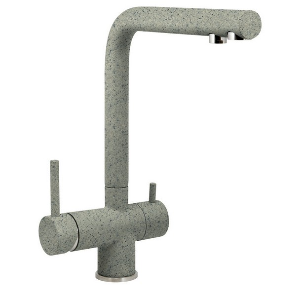белыйСмеситель SG14 с высоким изливом 2 в 1 с рычагом холодной и горячей воды справа и фильтрованной слева. Цвет бежевый.Размеры: бежевый.Размеры:Высота смесителя 327 мм