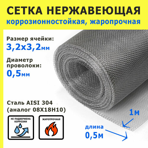 Сетка нержавеющая 3,2х3,2х0,5 мм для фильтрации, очистки, просеивания. Cталь AISI 304 (08Х18Н10). Размер 1х0,5 метр.