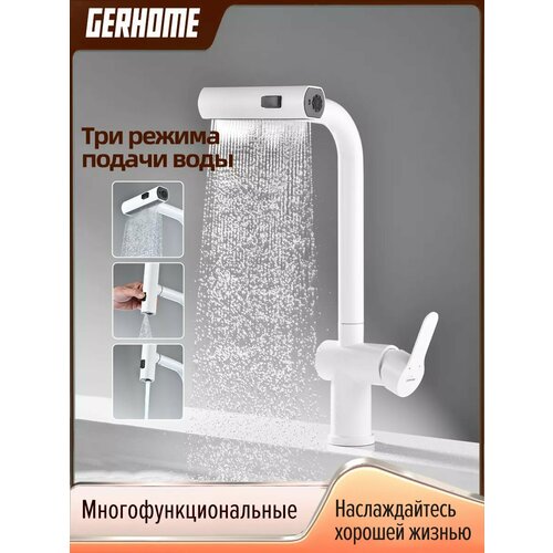 серыйДобро пожаловать в фирменный магазин Gerhome. Здесь мы стремимся обеспечить вам приятный опыт покупок, качественные товары и услуги. Качественный материал: Смеситель для раковины в основном изготовлен из отборного латунного материала, обладающего отличной коррозионной стойкостью и прочностью, длительным сроком службы; текстура и блеск качественного материала придают изделию элегантный и нежный вид; форма имеет модный и современный дизайн, сочетающий инновационные технологии и качественные материалы, чтобы обеспечить вам комфортное использование. Многофункциональный смеситель для раковины: смеситель имеет уникальные три режима подачи воды - обычный режим подачи воды вниз, режим подачи воды вверх и режим душа, которые можно переключать с помощью кнопки-шестеренки, чтобы удовлетворить различные потребности; в то же время в смеситель встроен телескопический шланг, который можно растянуть, чтобы решить проблему ограниченной площади уборки, а функция подъема высоты и поворота угла поможет вам легко очистить большие