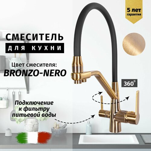 Смеситель для кухни с подключением к фильтру с гибким изливом из латуни Vivi Felice (бронза с черным)