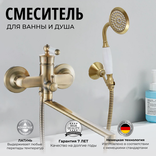 Смеситель для ванны и раковины с длинным изливом/ бронза/ латунь/ Смеситель с длинным поворотным изливом 35 см/ Бронзовый в ретро стиле