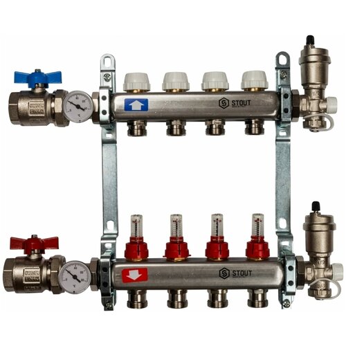 Коллектор распределительный Stout SMS 0907 000004 на 4 контура в сборе с расходомерами 1"/3/4"x4