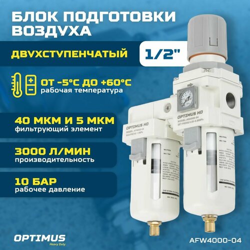 Блок подготовки воздуха 1/2" двухступенчатый с влагоотделителем, регулятором и манометром OPTIMUS HD AFW4000-04