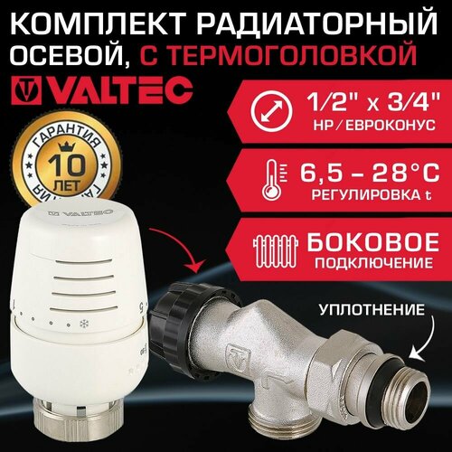 Комплект терморегулирующий осевой 1/2" НР x 3/4" Евроконус VALTEC для подключения радиатора отопления: клапан VT.180. NER.04 и термоголовка VT.5000