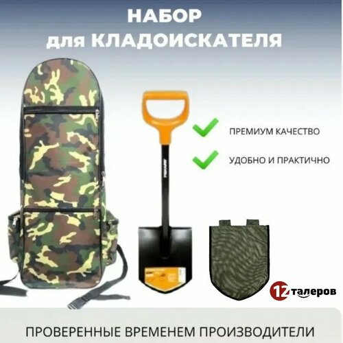 Набор для кладоискателя "12 Талеров" Цвет "Камуфляж": Рюкзак для металлоискателя и лопаты, лопата, чехол на лопату.