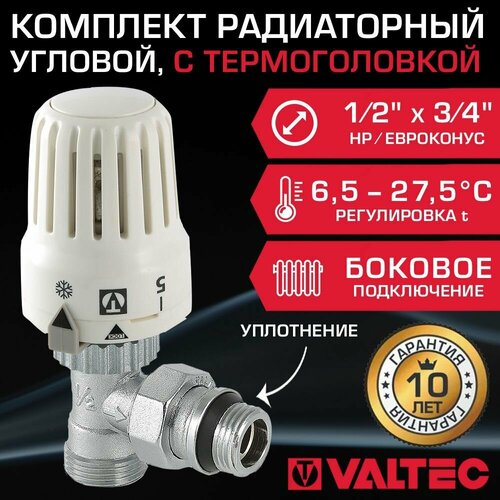 Комплект терморегулирующий угловой 1/2" НР x 3/4" Евроконус VALTEC для подключения радиатора отопления: клапан VT.031. NER.04 и термоголовка VT.3000