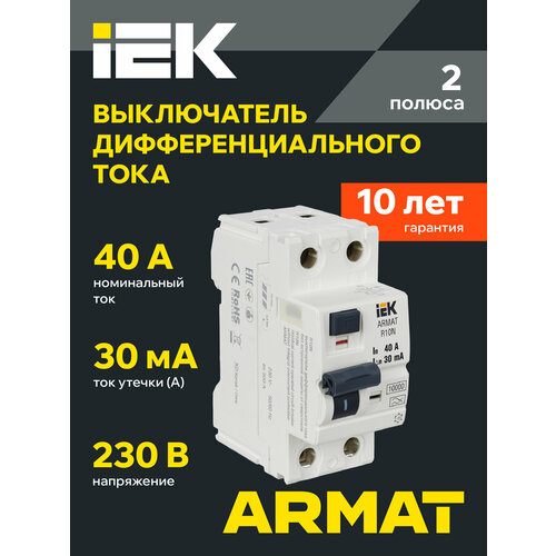 Выключатель дифференциального тока R10N 2P 40А 30мА тип A IEK серия ARMAT