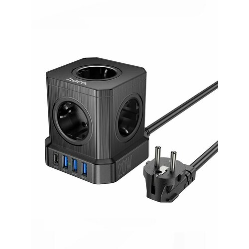Сетевой фильтр на 3 розетки, 3 USB, 1 PD, 1.5м, AC7A, HOCO, черный