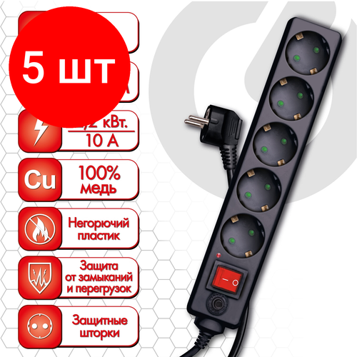 Комплект 5 шт, Сетевой фильтр SONNEN U-3518, 5 розеток, с заземлением, выключатель, 10 А, 1.8 м, 513488