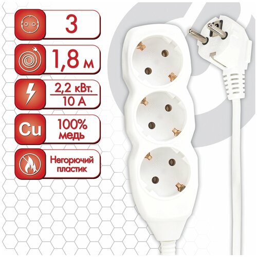 Удлинитель сетевой SONNEN U-131G, 3 розетки, c заземлением, 10 А, 1,8 м, белый, 511431 (цена за 1 ед. товара)