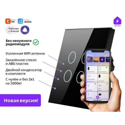 Новая версия Умный выключатель для Яндекс Алисы на 2000вт без нуля и С нулем 2в1 на 4 группу света