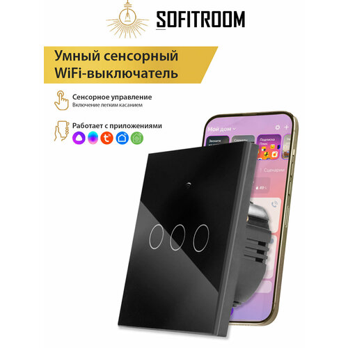 Умный сенсорный WiFi выключатель с Алисой 3 клавиши, Tuya, черный, универсальный без нуля и с нулем