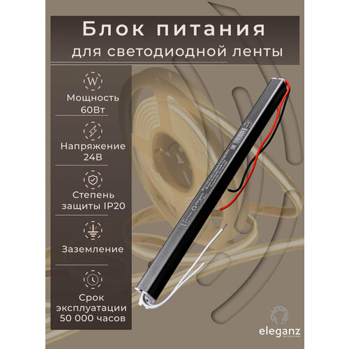 Блок питания 24v для светодиодной ленты (карандаш) "Eleganz 60w", узкий трансформатор для ленты, IP20