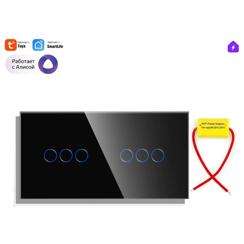 Два умных выключателя на 3 группы света, для Алисы, в одной черной рамке, без нуля, с WIFI, с двумя конденсаторами в комплекте, евростандарт