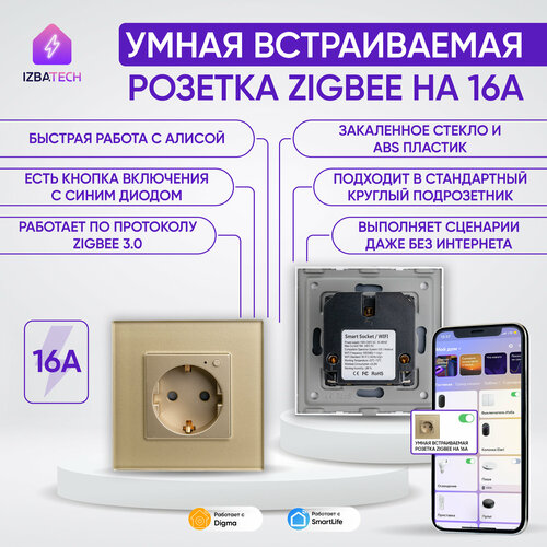 Умная встраиваемая розетка для Алисы на 16А стеклянная золотая