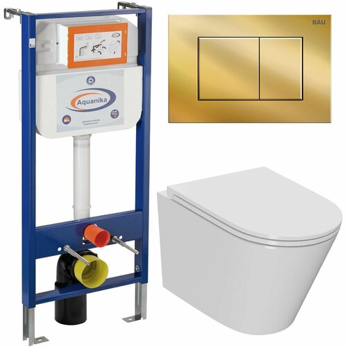 Комплект BAU 6 в 1: инсталляция BAU Aquanika, унитаз безободковый торнадо обратного потока Bau Nimb Hurricane-2, сиденье микролифт, золотая клавиша