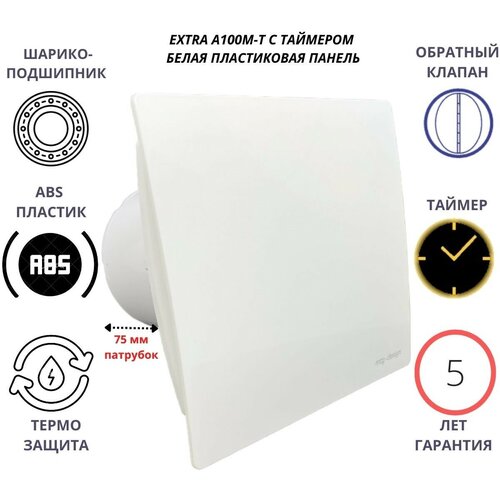 Вентилятор с таймером, D100мм, со стеклянной белой панелью и с обратным клапаном EXTRA A100М-T, Сербия