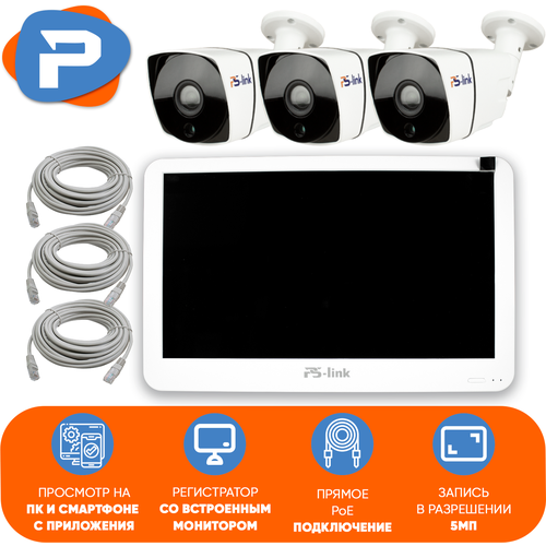 Комплект видеонаблюдения PS-link KIT-C503LCD IP-PoE/ монитор 10"/ 3 уличные камеры/ 5 Мп