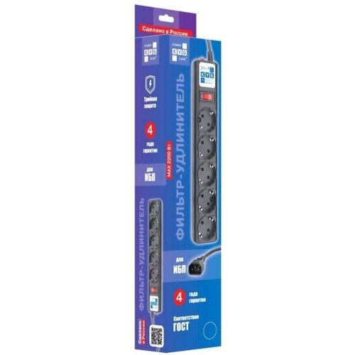 Сетевой фильтр Power Cube Ф1.9, 5 розеток, с/з, 10А / 2200 Вт серый 2 м 0.75 м² 324 мм 52 мм 41 мм 5