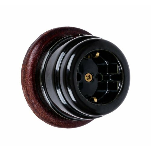 Ретро розетка с/з керамическая глянец, подрозетник вишня, с заземлением, накладная черная для открытой наружной проводки под винтаж Zion