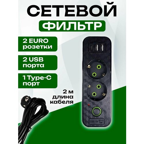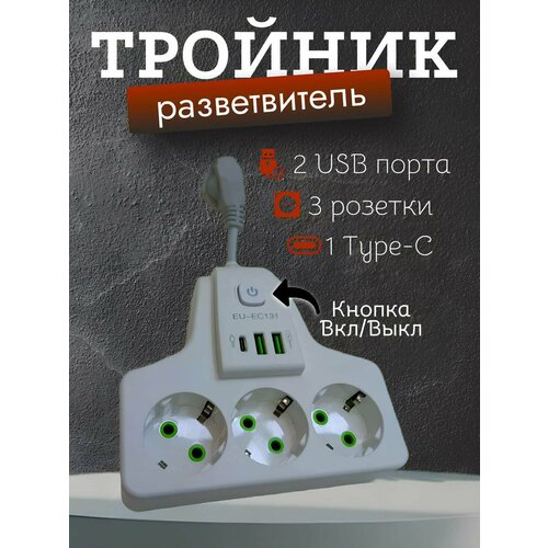 Сетевой разветвитель, тройник с 2 USB, 1 Type-C порт, 3 розетки, 2500ВТ