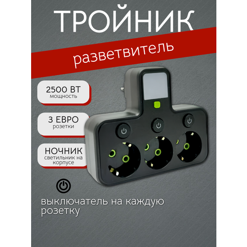 Тройник-разветвитель, 3 розетки, с выключателями, светильник, мощность 2500Вт