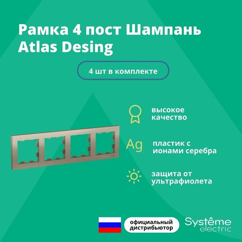 Рамка для розетки выключателя четверная Schneider Electric (Systeme Electric) Atlas Design Антибактериальное покрытие шампань ATN000504 4шт
