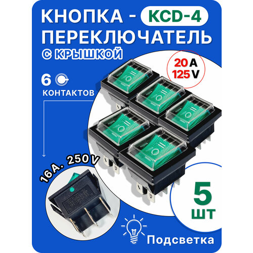 Кнопка зеленая КСД4(6контактов) с крышкой, 5шт, с встроенной подсветкой