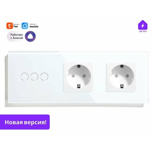 Умный выключатель на 3 группы + 2 розетки для Алисы с WIFI в одной стеклянной рамке, белая, работает без шлюза