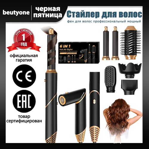 Профессиональный фен для волос beutyone 6 В 1, стайлер для волос, плойка для локонов с насадками, 3 режима, черный