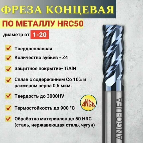 Фреза Твердосплавная Концевая 4 х10х4х50 мм Z4 металлу Монолитная HRC45 WC
