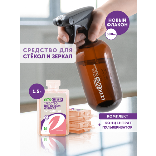 Средство для мытья стекол и зеркал EcoCaps, комплект концентрат в капсулах 3 шт + пульверизатор 500 мл