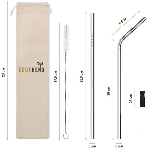Многоразовые металлические трубочки EcoTrend различного диаметра для напитков с силиконовым наконечником и чехлом для хранения, серебристые