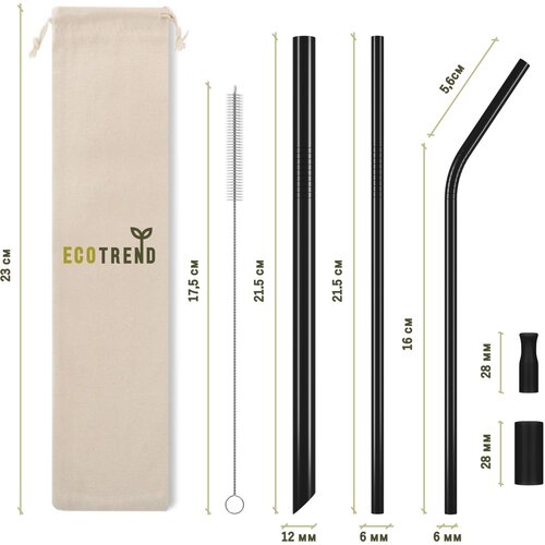 Многоразовые металлические трубочки EcoTrend различного диаметра для напитков с силиконовым наконечником и чехлом для хранения, черные
