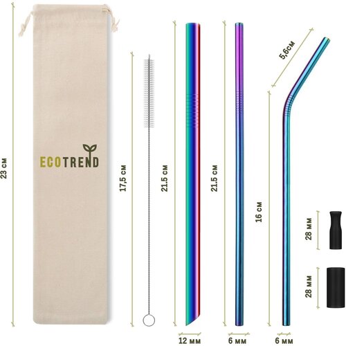 Многоразовые металлические трубочки EcoTrend различного диаметра для напитков с силиконовым наконечником и чехлом для хранения, переливающиеся