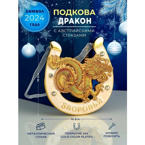 Декоративная подкова "Китайский дракон" с пожеланием "Здоровья", с эмалью и стразами 10*0,9*10см, символ года 2024 дракон, подарок на новый год