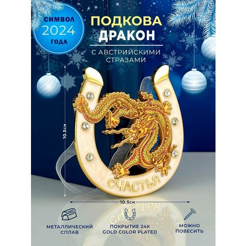 Декоративная подкова "Китайский дракон" с пожеланием "Счастья", с эмалью и стразами 10*0,9*10см, символ года 2024 дракон, подарок на новый год