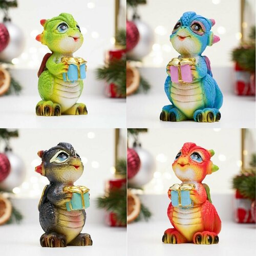 Фигурка Дракончик с подaрком 7,5*5*5см-4шт, символ года дракона 2024, набор фигурок, статуэтка новогодняя, подарок, сувенир на новый год