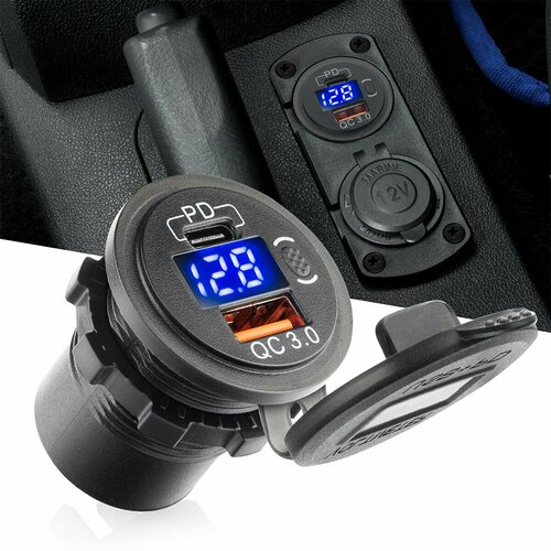 Разъем USB в авто врезной с вольтметром ElectroKot - розетка USB QC3.0 + Type-C PD быстрая зарядка с кнопкой синяя подсветка