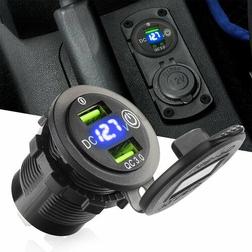 Разъем USB в авто врезной с вольтметром ElectroKot - розетка 2 USB QC3.0 быстрая зарядка с кнопкой синяя подсветка