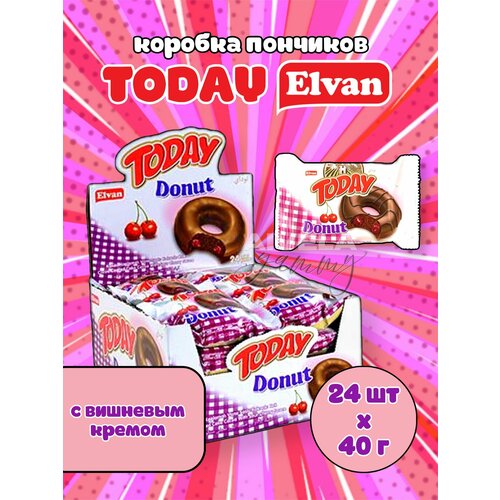 Elvan Today Donut Cherry/ Коробка пирожных для детского праздника в школу или сад/Пончики в глазури с вишней 24 шт в индивидуальных упаковках