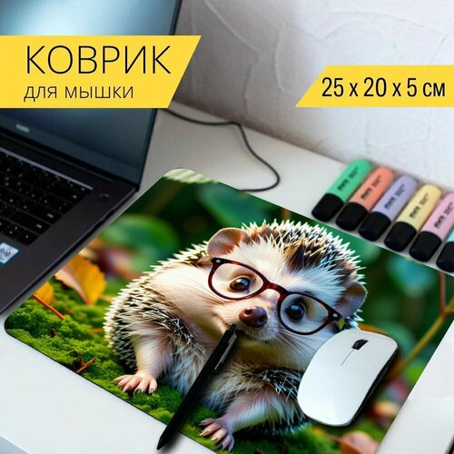 Коврик для мыши с принтом "Забавный ежик в круглых очках, сидящий среди листьев" 25x20см.