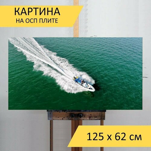 Картина на ОСП 125х62 см. "Быстрая лодка, скорость лодки, моторная лодка" горизонтальная, для интерьера, с креплениями