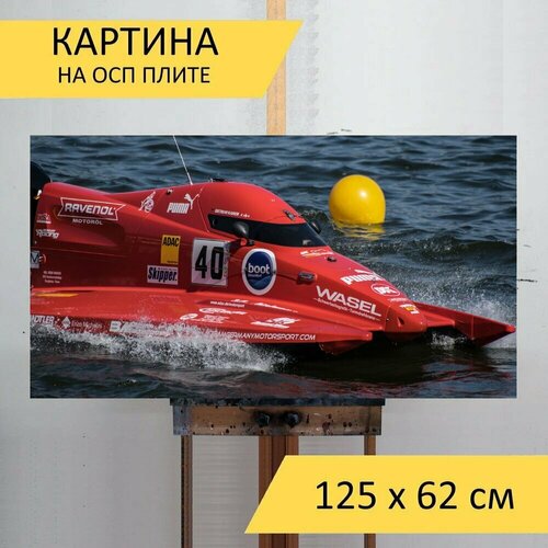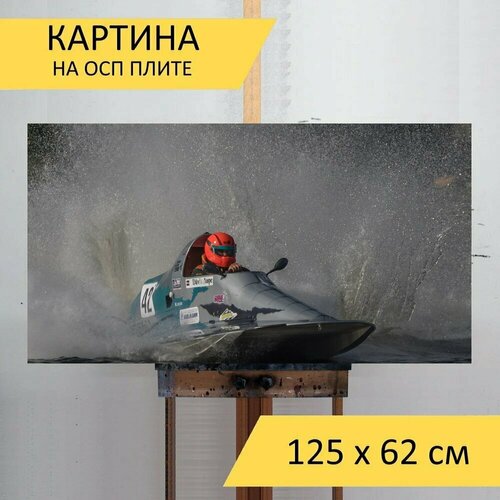 Картина на ОСП 125х62 см. "Моторная лодка, моторная лодка гонки, водный спорт" горизонтальная, для интерьера, с креплениями
